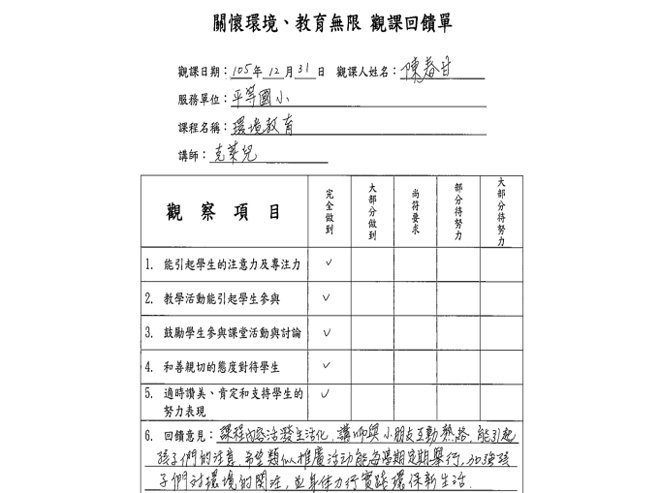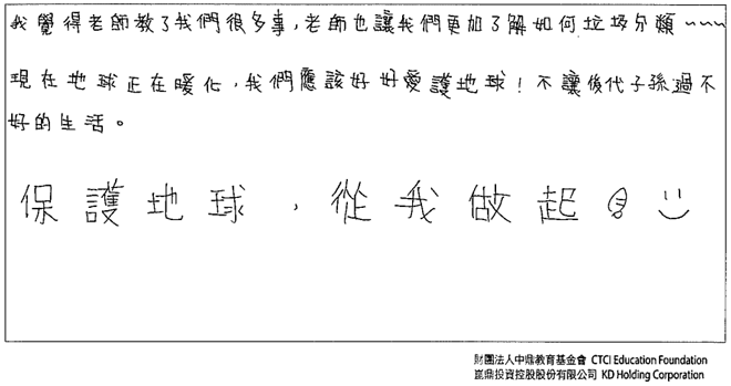 在此活動中,崑鼎計投入 65 人次,299 人時,共有540 位偏鄉的孩子們參與課程。在課後回饋部分,老師在觀課單上稱讚肯定中鼎集團志工的教學內容已臻專業的環教講師水準,孩童在學習單寫下課堂收穫並對志工講師充滿謝意,更加提升企業社會責任活動的價值。