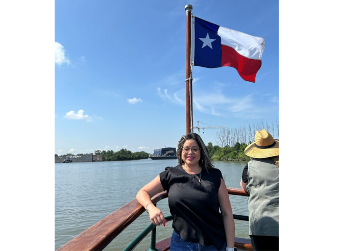 筆者Gina Leza擁有十餘年豐富人資工作經驗,目前在中鼎美國擔任人資主任。身後為德州州旗與休士頓航道。