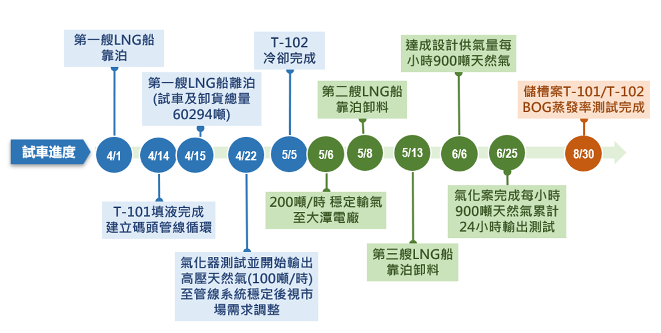本案的試車階段,亦面臨著諸多考驗。其中,因本案包含了目前全台最長的2.5公里48吋卸料管線,在進行試車前,中鼎團隊便已進行全面向的評估,考量到LNG為約-162℃之極低溫液體,如注入至常溫的管線,將因劇烈的溫差導致管線產生弓脹效應(Thermal Bowing),進而變形毀損。因此,在LNG進液進行填管作業前,接收站內的LNG管線及儲槽皆須事先冷卻,將LNG管線上下溫差控制在60度以內。為此,中鼎團隊將卸料管線預冷至-80~-100℃,再進行LNG進液填管。同時,更嚴格遵守儲槽冷卻期間,儲槽必須遵守底板降溫速率不得超過每小時-3~-5 ℃,以及儲槽側壁及底板溫度溫差等規範。 所謂的管線預冷作業,即是透過LNG載運船,提供溫度-120 ℃以下,且流量每小時20~ 23噸的冷NG(Natural Gas,透過船上蒸發器將船艙內的LNG氣化產生),才足以讓長達2.5公里的48吋管線卸料管線及1.8公里的20吋冷循環/輸出管線預冷至需求溫度,管線預冷作業結束後,即可從船方輸出LNG接續進行48吋卸料管線及20吋冷循環/輸出管線填液作業。中鼎向業主會報上述評估並獲核可後,正式於試車階段採用此方案,並經歷了長達133.5小時的冷卻及填液歷程,在嚴密的監測及把關下,圓滿完成此項艱鉅任務。