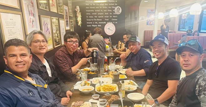 Having a great time with colleagues at a Filipino restaurant during the Bakersfield Renewable Fuels construction project, with Mr. Romero pictured first from the left.