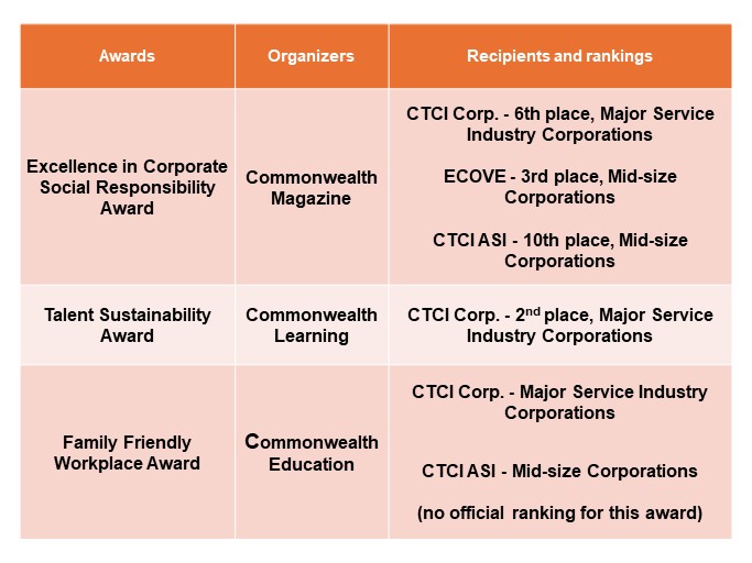 TAIPEI, October 28, 2025- CTCI, a “Guardian of Sustainable Earth,” is pleased to announce that three TWSE/TPEx-listed Group companies are recipients of this year’s Commonwealth Media sustainability awards, including Excellence in Corporate Social Responsibility Award, Talent Sustainability Award, and Family Friendly Workplace Award, in recognition of their commitment to ESG and outstanding performance.