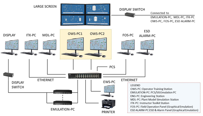 An OTS for an LNG terminal isn’t just about making a process simulation—it’s about recreating how the real plant actually thinks and reacts. To achieve that level of realism, the simulator must connect directly to the same engineering databases used by the Distributed Control System (DCS) and Safety Instrumented System (SIS). These contain all the critical logic—alarms, interlocks, and shutdown sequences—that define how the terminal operates safely and efficiently in both routine and emergency conditions. The OTS is developed from the latest DCS/SIS configuration data, creating a high-fidelity virtual replica of the actual control environment. Every scenario, from a standard start-up to a compressor trip, follows the same logic and timing as it would in real operations. To support this, the OTS is structured around several connected modules, each handling a key part of the simulation system. This includes Model Station (MDL), Instructor Workstation (ITF), Human Interface Station (HIS), Field Operated Device Station (FOS), Engineering Station (ENG), DCS/SIS Simulator Station (SIM), SIS Alarm Station, OTS Network and Data Storage, Large Screen System (Video Wall), and Printer and Logging System (Figure1).