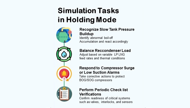 Among the various OTS training scenarios, Holding Mode is a stable yet essential environment where operators can refine the competencies that underpin safe and reliable LNG terminal operations. Holding Mode refers to the operational state where no LNG is being transferred to or from the storage tanks, but the terminal continues to process and send out regasified natural gas to the pipeline. Holding Mode is featured as the flagship OTS scenario because it reflects the terminal’s routine operating conditions. Unlike ship unloading, which occurs periodically, Holding Mode requires continuous management of tank pressure, BOG behavior, and system readiness. This makes it the most relevant and frequently practiced scenario for daily operations. Contrary to common perception that Holding Mode is a period of inactivity, it is in fact a highly controlled operating condition that requires continuous attention. Even when no LNG is entering or leaving the tanks, the entire system remains pressurized. Operators must closely monitor tank pressure and sustain recondenser circulation using LP LNG to absorb boil-off vapor. Without proper attention, issues such as compressor cycling, tank stratification, or alarm overload may arise. Maintaining the balance between tank pressure, temperature, and boil-off dynamics is essential, and the OTS brings this complexity to life by treating Holding Mode as a fully interactive training environment. Under Holding Mode, an OTS trainee would engage in key activities such as identifying gradual increases in tank pressure, adjusting recondenser load to match fluctuating LP LNG feed, handling compressor surge conditions or low-suction alarms, and completing periodic checklists to verify safety-critical systems. The simulation exercises help identify common operating errors during Holding Mode, such as overlooking pressure trends or failing to manage rising BOG load. They help strengthen operator situational awareness, improve responsiveness to control loop behavior, and build the confidence needed to take early corrective action.