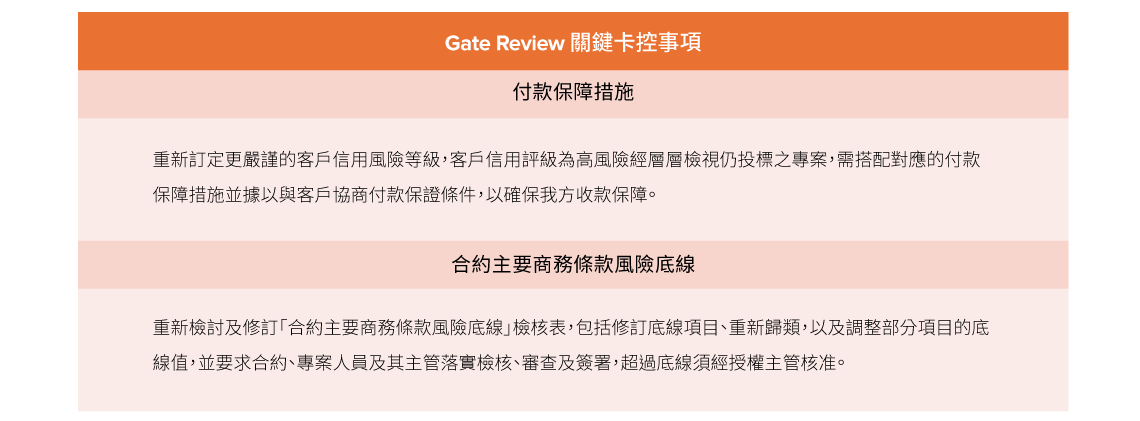 針對專案報價階段風險管控,增訂投標階段的Gate Review(關卡管控機制),明確各個Gate的管控事項,所有標案均應依Gate Review管控規定辦理。就兩個關鍵的卡控事項介紹如下圖: