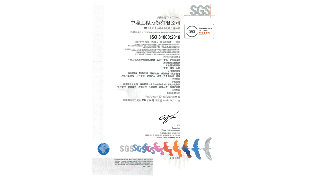 中鼎工程於2024年通過ISO 31000稽核,獲SGS卓越評等,展現國際級風險管理能力。