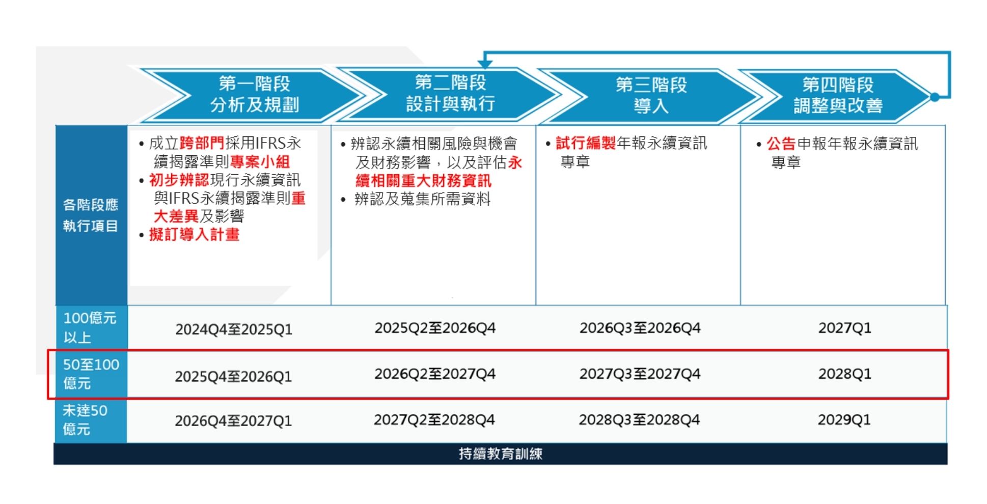 導入IFRS不僅符合國際規範,更是深化企業體質、強化韌性的契機,其效益涵蓋: .提升投資人信任,降低資訊不對稱:IFRS提供全球統一的語言以消除「漂綠」疑慮。當企業能以財務等級的嚴謹度揭露永續風險,進而吸引追求長期穩定的價值型投資人(如主權基金、勞退基金)。 .內部管理優化,跨部門整合:由於永續議題涉及多個部門,需建立跨部門資訊彙整流程與內控機制,以強化資訊正確性與完整度。 .提前因應風險與掌握機會:企業可透過IFRS框架,將抽象的風險轉化為「量化」的財務影響,而能將原先的被動應對轉為主動避險;同時發掘潛在低碳綠色商機或轉型機會,在落實減碳同時提升市場競爭力。 對此,我國金管會於2023年8月發布「我國接軌IFRS永續揭露準則藍圖」,上市櫃公司依資本額分三批次適用IFRS永續揭露準則,各批次皆規劃四個階段,各階段執行項目需於金管會規範時間內完成,如下圖所示,後續需提報董事會後向證交所進行申報。