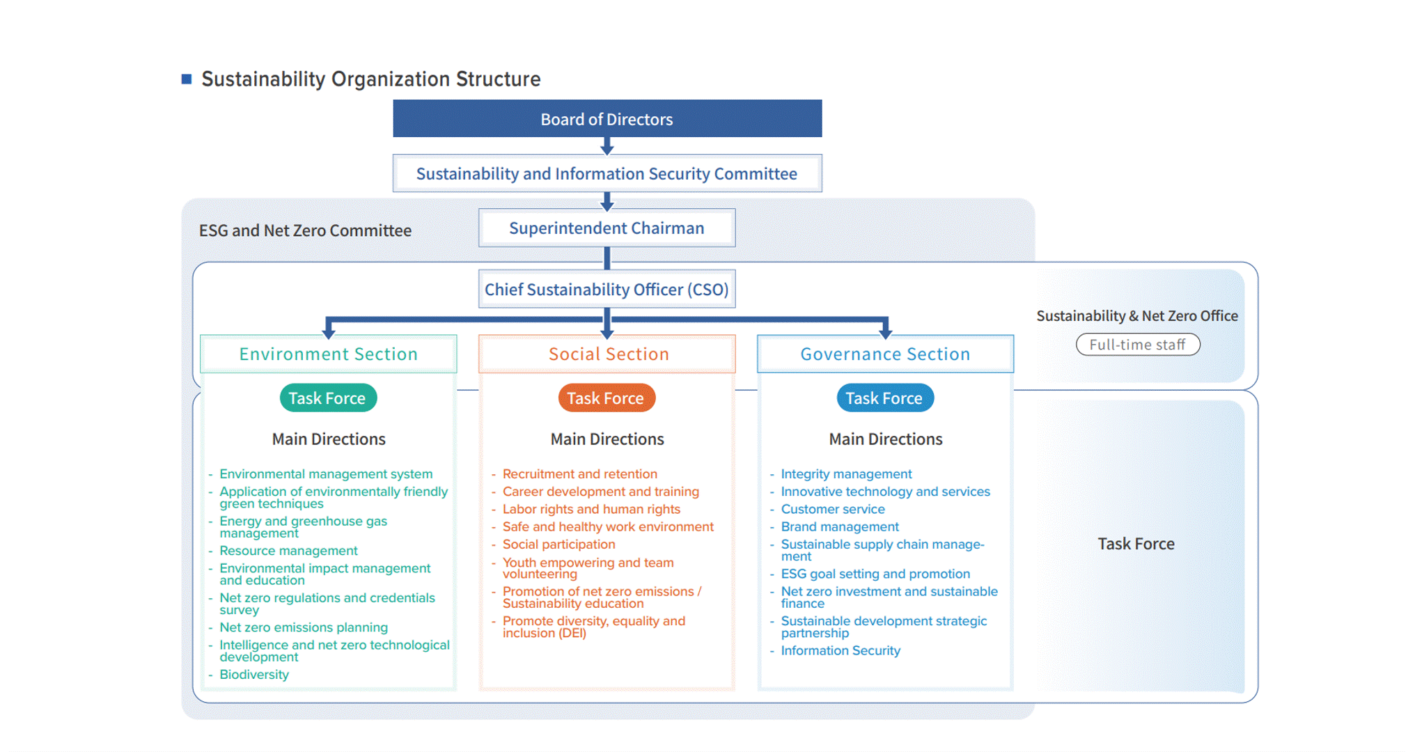 As sustainability issues continue to diversify and deepen, CTCI Group renamed its former Sustainable Development Committee under the Board of Directors to the ESG & Net Zero Committee in 2021, and further upgraded it in 2025 to the Sustainability and Information Security Committee. The upgraded committee encompasses three key governance pillars—sustainability development, net-zero emissions, and information security—ensuring alignment with stakeholder priorities. It also conducts regular reviews and tracks performance to drive continuous improvement. Under this governance structure, CTCI has established a Group-level Sustainability and Net Zero Office and appointed a Chief Sustainability Officer (CSO) to oversee the formulation of sustainability and net-zero strategies, action planning, and implementation across the Group.