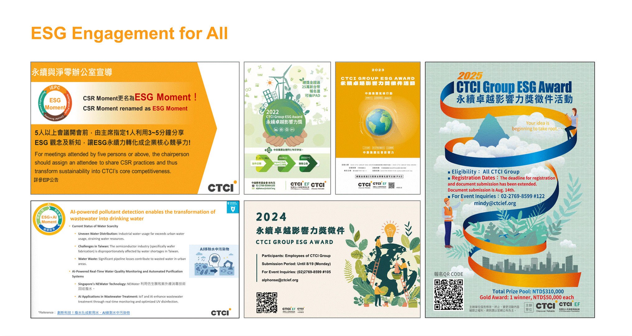 CTCI continuously broadens and deepens its sustainability advocacy through diverse exchanges and engagement activities. In recent years, the Group has organized events such as the Forum on Sustainability and Net-Zero Leaders, ESG Sustainable Engineering Workshops, International ESG Strategy Seminars for the Engineering Industry, and the Taiwan Sustainable Engineering Symposium. These platforms foster sustainability dialogue and knowledge sharing among internal and external stakeholders, further strengthening organizational resilience and momentum. In 2025, the Group upgraded its “ESG Moment” initiative to “ESG × AI Moment.” Building on the vision of “embedding sustainability DNA and realizing ESG by all,” the initiative integrates artificial intelligence (AI) into sustainability practices to demonstrate the cross-domain value of “ESG × AI.” By leveraging innovation and technology, CTCI aims to deepen sustainability implementation across all aspects of its operations. Since 2022, CTCI Group, in collaboration with the CTCI Education Foundation, has hosted the CTCI Group ESG Award for Sustainability Excellence and Impact, which entered its fourth year in 2025. In addition to the existing award themes of Environmental Action and Social Impact, the program has introduced the Sustainability Ambassador Initiative, encouraging employees to explore innovative, tangible ways to contribute to sustainability through their daily work.