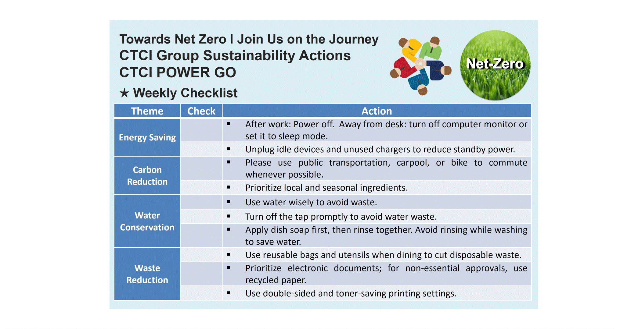 This year, CTCI launched its first-ever Sustainability Literacy Survey, adopting a scientific approach to assess the maturity of the organization’s sustainability culture. The survey covered 12 core topics, including net-zero emissions, environmental protection, social engagement, and corporate governance, with a total of 4,136 employees voluntarily participating. The high participation rate reflected a strong organizational consensus on sustainability issues. The results not only provide an empirical foundation for policy formulation but also establish a quantitative mechanism to measure the degree of sustainability integration—transforming the concept of “ESG for All” from advocacy into concrete action. In June 2025, during Environmental Month, the Group launched “CTCI POWER GO – Together on the Journey to Net Zero”, an initiative designed to promote sustainable action across the organization. Focusing weekly on four key themes—energy saving, carbon reduction, water conservation, and waste reduction—the program uses a checklist-based tracking and feedback mechanism to reinforce sustainable habits in daily life. At the same time, CTCI introduced a bi-weekly “Green Living Day” initiative, aligned with the Net Zero Green Living Action Guide issued by Ministry of Environment. The campaign integrates digital tools such as traceable restaurant platforms and vegetarian dining maps, complemented by thematic lectures on “Climate Change and Sustainable Healthy Diets.” Through these actions, CTCI elevates sustainable dining from an individual choice to an organizational culture, demonstrating a systematic approach to lifestyle transformation within the enterprise.