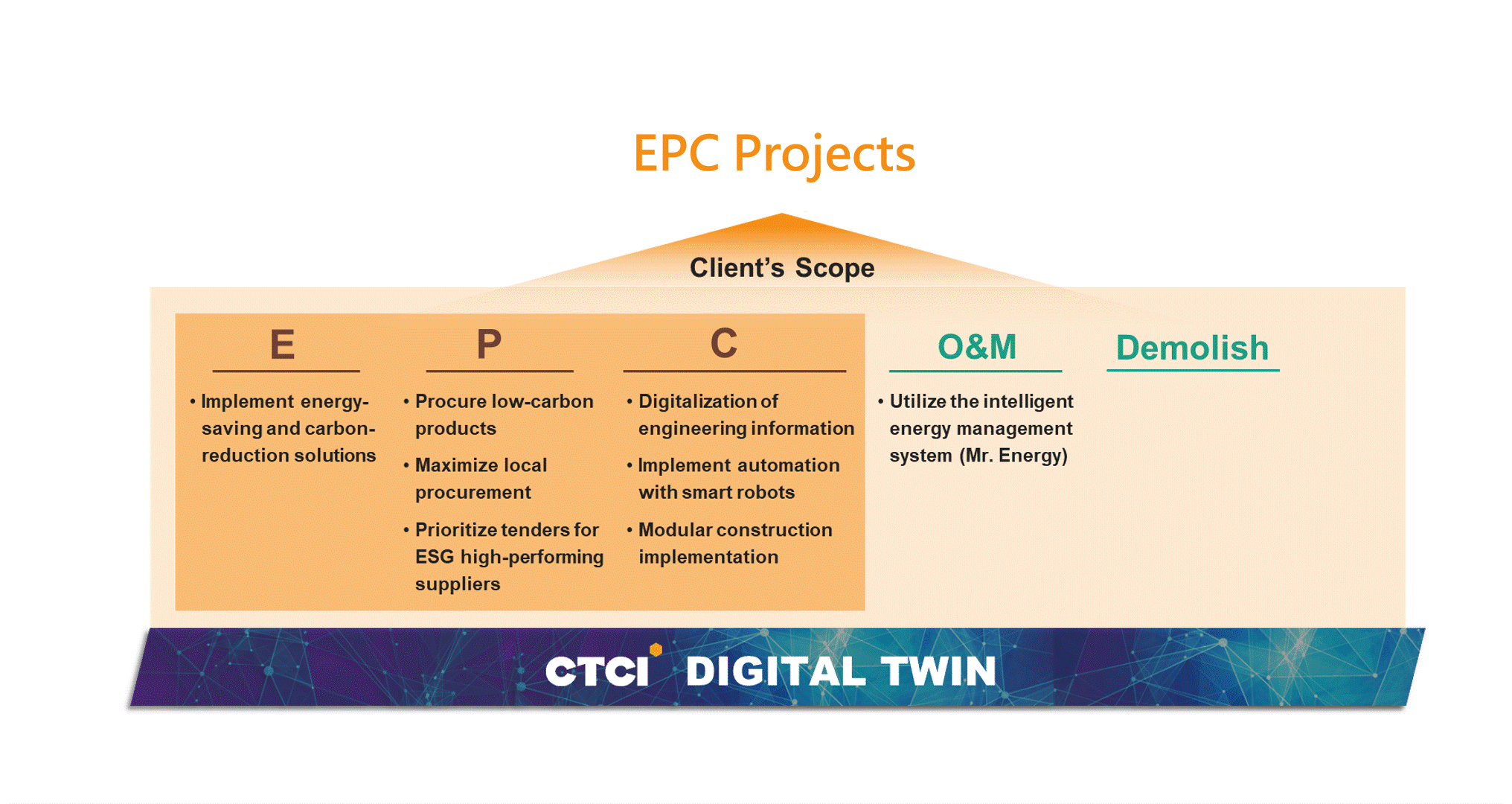 Through its three core dimensions of Green Engineering and sustainable supply chain management, CTCI effectively assists clients in managing carbon risks and improving energy efficiency. By strengthening collaboration across the entire value chain, CTCI enhances the overall sustainability value of engineering projects. 1. Green Engineering CTCI’s green engineering initiatives are structured around three core pillars: Green Technology, Green Contracting, and Green Investment. A. Green Technology: CTCI continuously adopts innovative low-carbon and energy-saving technologies, having accumulated over 200 practical decarbonization and efficiency improvement solutions that have been successfully applied to projects across various sectors, achieving remarkable results. B. Green Contracting: This refers to engineering projects undertaken by CTCI that benefit the environment and contribute to low-carbon transformation. These include projects in low-carbon and clean energy, water resources, waste-to-energy, and green transportation. Recent milestones include Taiwan’s first Carbon Capture and Storage (CCS) surface facility EPC project, a carbon capture pilot plant EPC project for a leading semiconductor manufacturer, and Construction, Operation, and Maintenance of the Hsinchu Desalination Plant project. As of September 2025, CTCI’s green and low-carbon engineering backlog has grown significantly, rising from NTD 43.8 billion in 2015 to NTD 376 billion, demonstrating the Group’s strong momentum in sustainable contracting. C. Green Investment: CTCI’s green investment portfolio includes solar photovoltaic plants and reclaimed water facilities, with total contract value exceeding NTD 200 billion. The Group has also secured over NTD 10 billion in green financing, guarantees, and bonds, generating stable, long-term revenue while contributing to environmental protection.