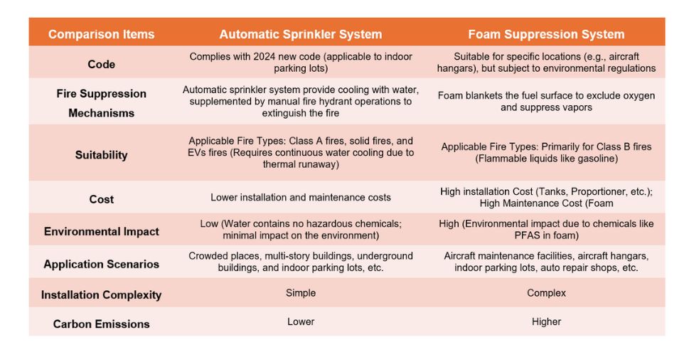 In summary of the preceding chapters, automatic sprinkler systems are suitable for most fire scenarios, including electric vehicle (EVs) fires. Their greatest advantage lies in the ability to automatically activate during the initial stages of a fire, rapidly controlling temperatures and suppressing fire spread before firefighting personnel arrive. This gains critical time for evacuation, reducing casualties and property damage. The system is stable, reliable, and features low maintenance costs with minimal environmental impact. With strong advocacy and encouragement from municipal fire regulatory authorities, the adoption of automatic sprinkler systems in indoor parking lots has clearly become the future trend. While foam suppression systems are highly effective against oil fires, their high costs, environmental impact, and limitations in addressing electric vehicle (EVs) fires make them less suitable than automatic sprinkler systems in certain contexts. With the advancement of regulations and environmental awareness, an increasing number of indoor parking facilities are likely to restrict or phase out foam suppression systems. In summary of the above and in response to energy policies and international trends, automatic sprinkler systems have become the preferred choice for fire safety equipment in indoor parking lots due to their high efficiency, low carbon footprint, and eco-friendly characteristics. They not only effectively reduce costs but also ensure environmental sustainability and align with net-zero carbon emission goals.