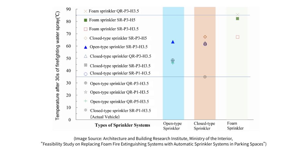 The report "Feasibility Study on Replacing Foam Fire Extinguishing Systems with Automatic Sprinkler Systems in Parking Spaces" by the Architecture and Building Research Institute (ABRI), Ministry of the Interior, focused on internal combustion engine (ICE) vehicles in indoor parking environments. Through experimental comparisons of the cooling effects between automatic sprinklers and foam suppression, the study explored whether automatic sprinkler systems can prevent fire spread from a burning vehicle to adjacent ones.
