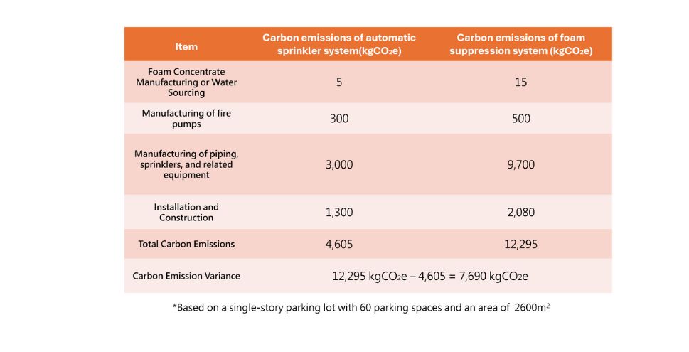 Based on the system processes described in previous chapters, foam suppression systems are more complex than automatic sprinkler systems, resulting in higher equipment procurement and construction costs, as well as higher carbon emissions during construction. Using a single-story parking lot with 60 parking spaces (area: 2,600 m²) as the calculation basis, the carbon emission factor for tap water from the Taiwan Water Corporation is approximately 0.156 kgCO₂e per unit (m³). In contrast, the carbon emissions from producing foam concentrate range from approximately 3 to 10 kgCO₂e/kg. When further accounting for the manufacturing of equipment and piping, as well as the carbon footprint of installation labor, adopting an automatic sprinkler system instead of a foam system reduces carbon emissions by approximately 7,690 kgCO₂e (refer to Table 2).