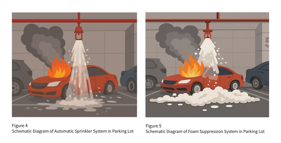 From a fire suppression perspective, automatic sprinkler systems not only prevent inter-vehicle fire spread but also provide a continuous and massive supply of water for cooling, effectively confining the fire and controlling propagation. In response to the challenges of contemporary parking facility fires, automatic sprinkler systems have become a compelling alternative to foam suppression systems.