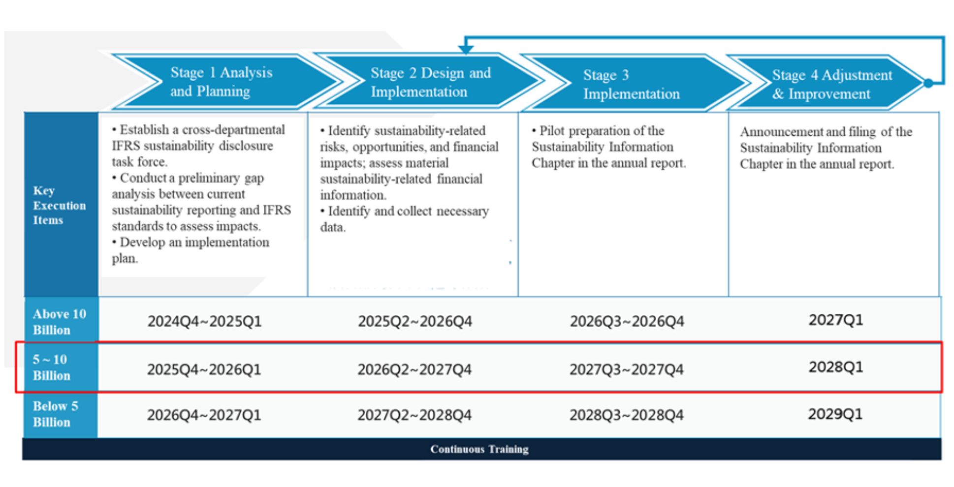 Adopting IFRS not only ensures compliance with international standards but also serves as a strategic opportunity to deepen corporate fundamentals and strengthen organizational resilience. Its benefits include: .Enhancing investor trust and reducing information asymmetry: IFRS provides a unified global language to eliminate "greenwashing" concerns. When companies disclose sustainability risks with financial-grade rigor, they can attract long-term value investors (such as sovereign wealth funds and labor pension funds). .Optimizing internal management and cross-departmental integration: Since sustainability issues involve multiple departments, it is necessary to establish cross-departmental information aggregation processes and internal control mechanisms to strengthen the accuracy and completeness of information. .Proactively addressing risks and seizing opportunities: Through the IFRS framework, companies can transform abstract risks into "quantified" financial impacts, moving from passive response to proactive risk mitigation. This also helps discover potential low-carbon green business or transition opportunities, improving market competitiveness while implementing carbon reduction. In response, Taiwan's Financial Supervisory Commission (FSC) released the "Roadmap for Taiwan's Alignment with IFRS Sustainability Disclosure Standards" in August 2023. Listed companies will apply the IFRS Sustainability Disclosure Standards in three batches based on their capital size. Each batch is planned in four stages, and the execution items for each stage must be completed within the timeframes specified by the FSC (as shown in the figure below). These must then be reported to the Board of Directors and filed with the Taiwan Stock Exchange (TWSE).