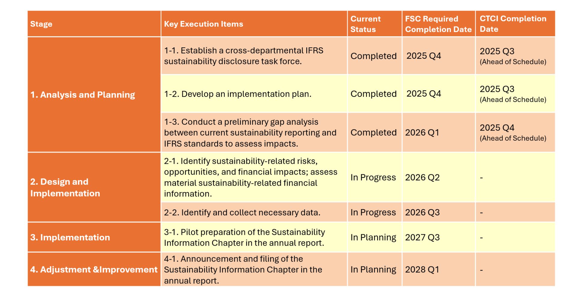 To ensure the smooth completion of the sustainability chapter by 2028, CTCI has established an IFRS implementation plan, which plans execution priorities and implementation paths in stages to push various tasks forward. Stage 1 was completed ahead of the FSC's required timeline.