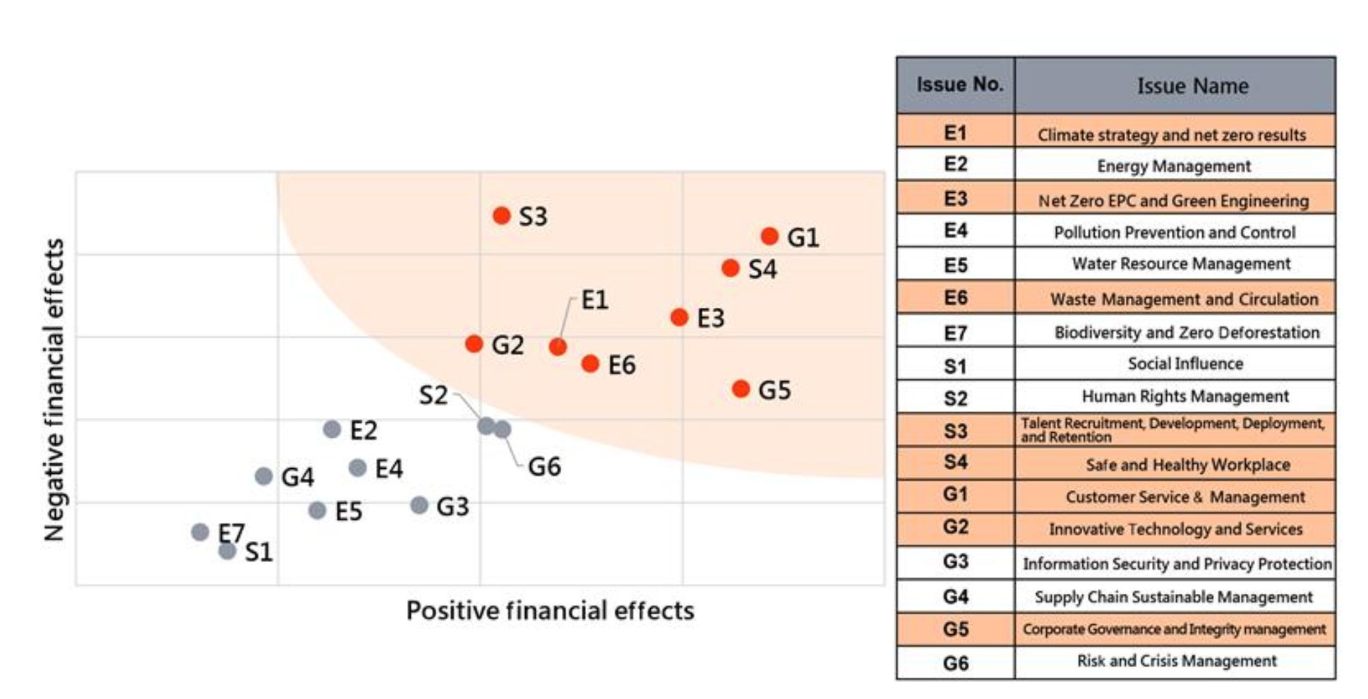 The Task Force referred to the Sustainability Accounting Standards Board (SASB) industry standards. It selected "Engineering & Construction Services," "Waste Management," and "Software & IT Services" as the primary industry categories, summarizing 17 sustainability issues. Then, through a survey conducted by the Task Force, 8 material sustainability issues were identified via a matrix (3 Environmental, 2 Governance, and 3 Social).