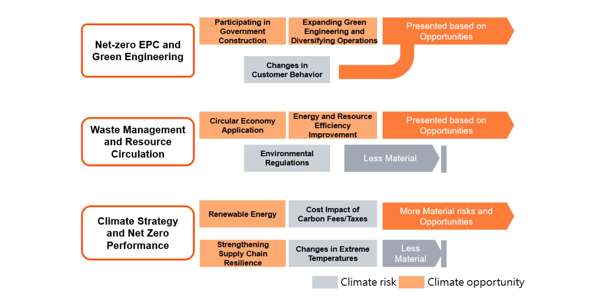 For the 8 material sustainability issues, the Task Force identified potential risks and opportunities through senior executive interviews. Taking "Net-zero EPC and Green Engineering" as an example, with "expanding green engineering and diversifying operations" as the primary development opportunity, CTCI has accumulated project track records in reclaimed water plants, rail engineering, Mr. Energy promotion, and Carbon Capture and Storage (CCS). Future directions will include science park development. To seize these opportunities, an "Energy Transition Strategic Group" has been established to drive strategic actions such as plant renovation, capacity enhancement, and Demo Site experiences. Additionally, "participating in government construction" and "responding to changes in customer behavior" also present development opportunities. Using the same analysis method, "Waste Management and Resource Circulation" and "Climate Strategy and Net Zero Performance" also show significant risk impacts and opportunity benefits, which will be used for further quantitative analysis.