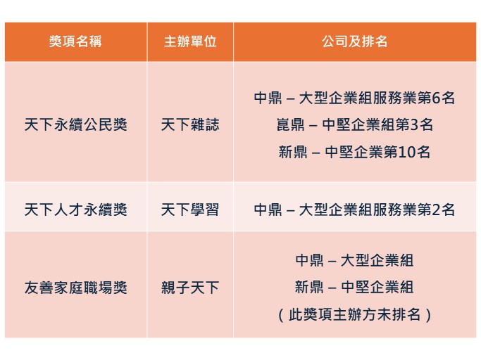 - 2025/10台灣: 中鼎集團ESG績效獲《天下》多項永續獎項肯定CTCI中鼎集團自許為「地球永續的把關者」,旗下三家上市櫃公司致力ESG的卓著績效,榮獲《天下雜誌》集團「天下永續公民獎」、「天下人才永續獎」、「友善家庭職場獎」等多項永續獎項肯定。