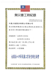 - 2016/04CTCI Headquarters Honored with “Cumulative Record without Accident Proof with a total of 33.89 million hours” by Occupational Safety and Health Administration, Ministry of LaborIn order to enhance the consciousness for both employers and employees in HSE field, the Occupational Safety and Health Administration, Ministry of Labor promotes the activities of “Cumulative Record without Accident Proof” and encourages public institutions to execute self-management to achieve the objective of ZERO accident. CTCI headquarters was honored with a cumulative record without accident proof from January 2007 to November 2015, with a total record of 33.89 million hours.