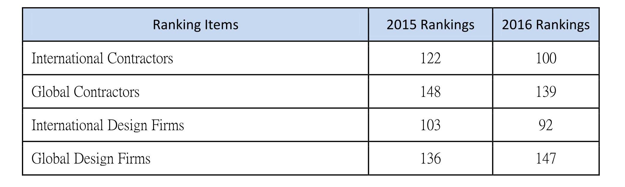 ENR, a prestigious international magazine, conducts its surveys for engineering companies annually. ENR rankings have strong credibility and are important indexes for international engineering industry. ENR rankings have two main categories which are design firms and contractors based on company’s annual sales revenues. Among the ENR rankings, companies in the "International" list are ranked on the basis of overseas revenues, whereas companies in the "Global" list are ranked according to their total revenues regardless of where the project is located. In recent years, CTCI Corporation constantly makes efforts on growth and successfully expands the international markets by enhancing the technical level, profitability, and international visibility. Therefore, CTCI Corporation continues to jump in rankings among international engineering companies.![]()