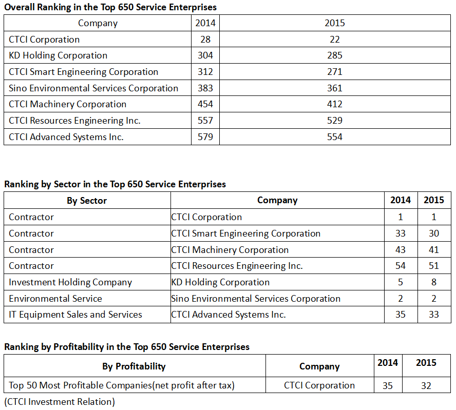 Tables below reveal all the rankings garnered by companies of CTCI in various sectors of the 2016 Top 650 Service Enterprises. CTCI Corporation improved itself for three years to the 22nd in terms of the overall ranking in the service sector and retained the leader in the contractor sector. Moreover, CTCI ranks the 32nd in profitability in the Top 650 Service Enterprises this year. KD Holding Corporation retained the 8th in investment holding company sector this year, and improved to the 285th in the service sector. CTCI Smart Engineering Corporation ranked the 30th in the contractor sector and the 271st in the service sector this year; Sino Environmental Services Corporation retained the 2nd in the environmental service sector and ranked the 361st in the service sector. CTCI Machinery Corporation ranked the 41st in the contractor sector and ranked the 412th in service sector. CTCI Resources Engineering Inc. ranked the 51st in the contractor sector and the 529th in service sector. Last but not least, CTCI Advanced Systems Inc. retained the 33rd in the IT equipment sales and services sector and ranked the 554th in the service sector this year.