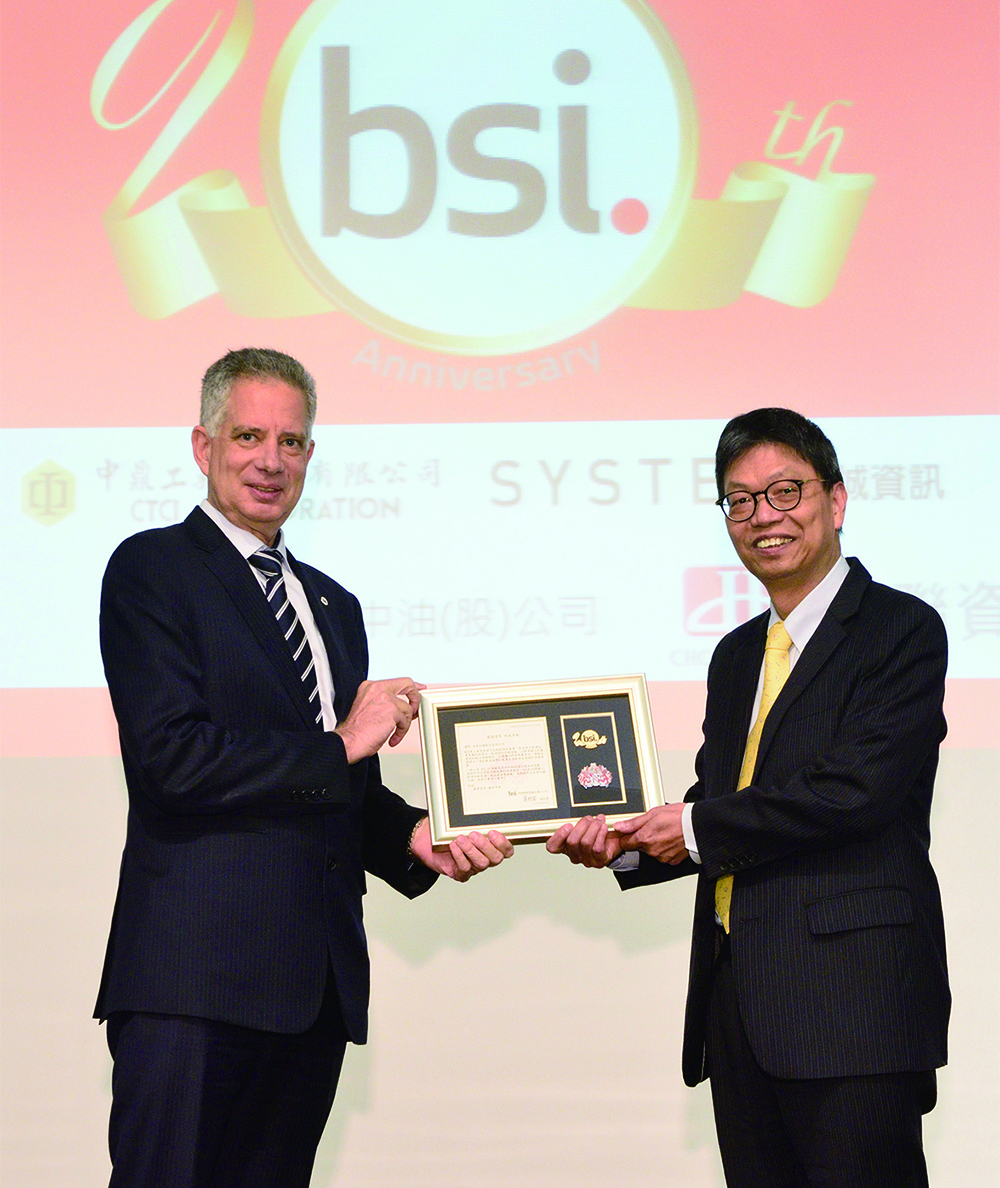 - 2016/04CTCI Recognized with Standard Pioneer Award by BSI Taiwan BranchTo fulfill corporate social responsibilities (CSR) and pursue sustainable operations, CTCI has been verified by a third party for its CSR practice since 2008, and is the first engineering company in Taiwan to pass Corporate Sustainability Report verifications. Moreover, CTCI is even a pioneer in the engineering industry to adopt GRI G4.0 indicators and pass AA1000:2008 high assurance levels. With our persistence to excellent corporate governance, compliance with international standards, and dedication to innovative management, CTCI was recognized with “Standard Pioneer Award” by the Taiwan Branch British Standards Institution (BSI), an authoritative international standardization and verification institute. The award ceremony was held on April 12th in the 20th Anniversary Forum of Taiwan Branch. On behalf of the company, SVP of the Administration & PR Division Mr. Andrew Tsai received the award from Mr. David Horlock, Managing Director of Asia Pacific Region.