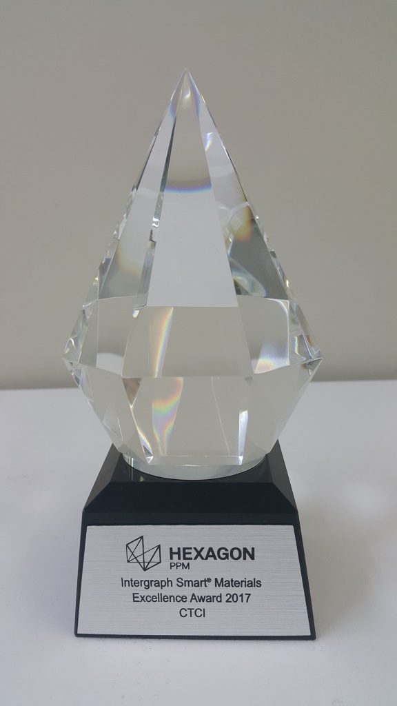 With its emphasis on minimizing the air pollution issue for incineration plants, KD Holding once again ranks the 3rd at the list under the category of “mid-size enterprise” this year. With conducts including inviting local residents and students of surrounding areas for on-site visit of incineration plants to advocate energy saving and resource recycling concepts, KD Holding’s performance is well recognized by the judging panel. Winning the prize is a great honor for KD and CTCI Corporation, affirming CTCI’s efforts in fulfilling CSR. - 2017/06CTCI Honored with 2017 Hexagon Intergraph Smart Materials Excellence Award for Successful Deployment of Intergraph Smart Materials Solutions for Materials ManagementWith years of successful deployment of Intergraph Smart Materials (MARIAN) solutions in its EPC project executions, CTCI is selected as the 2017’s recipient of Smart Materials Excellence Award by Hexagon. The award ceremony was held on June 14th in Hexagon's annual international conference at HxGN Live in Las Vegas as part of the PFC introduction session.