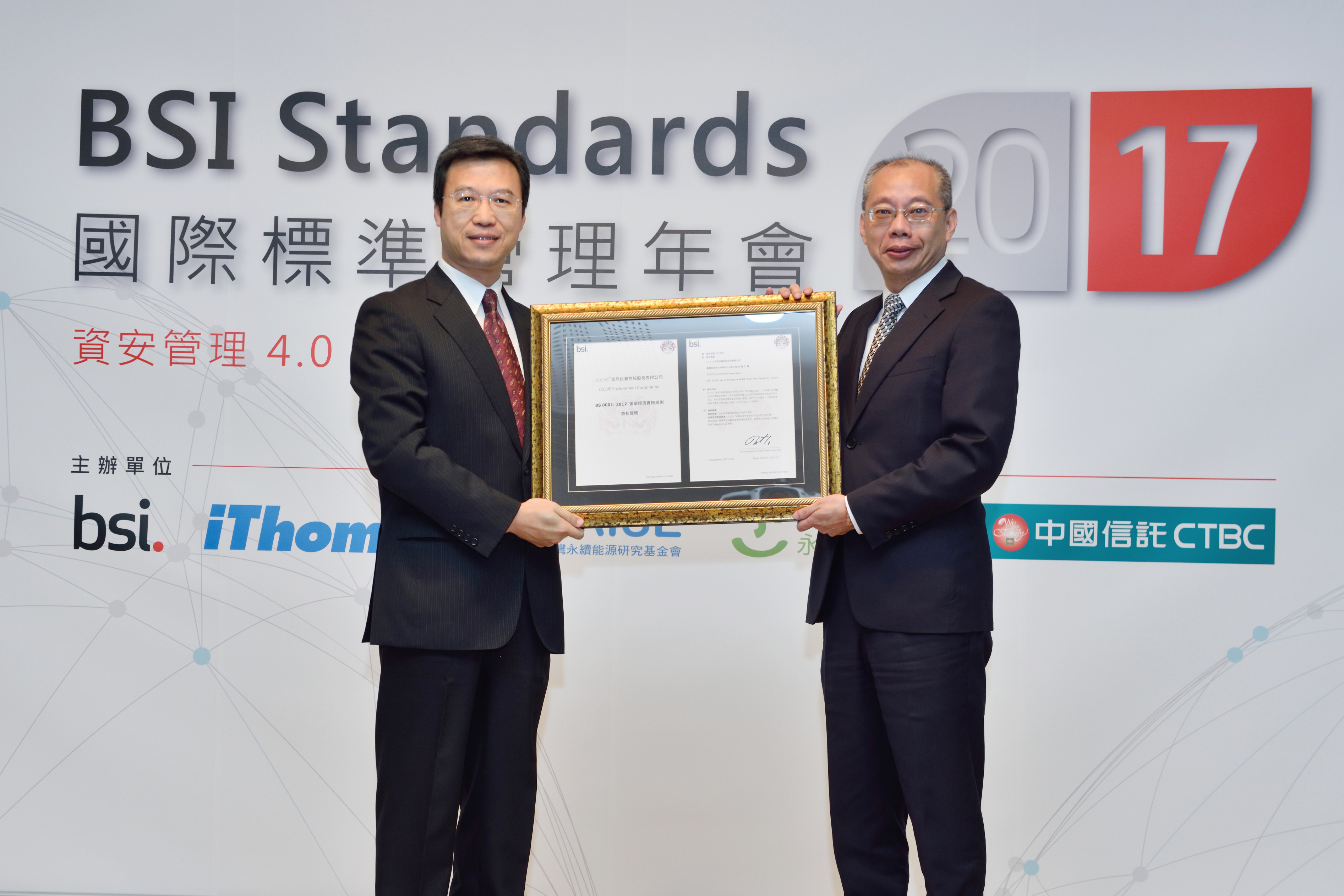 - 2017/11ECOVE Environment Corporation Obtained the World’s First BS 8001:2017 Circular Economy Certification from BSIECOVE Environment Corporation, the industry-leading resource cycling services provider, has long been dedicated to circular economy; the efforts have been honored with the BS 8001:2017 Circular Economy Certification and Circular Economy Sustainability Award by British Standard Institution (BSI). The award ceremony was held on Nov. 1st. ECOVE Environment Corporation Chairman J. J. Liao accepted the awards on behalf of the company.