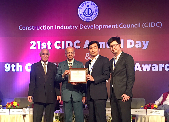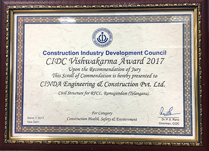 - 2017/03CINDA, Company of CTCI, Honored with Vishwakarma Award by CIDC of India for Outstanding Construction Health, Safety & Environment PerformanceCINDA Engineering & Construction Pvt. Ltd. (CINDA), a subsidiary company of CTCI in India, has been honored with Vishwakarma Award under the category of Construction Health, Safety & Environment by Construction Industry Development Council (CIDC) for outstanding performance of Ramagundam Fertilizer Plant Civil Work for U&O Package owned by Ramagundam Fertilizer & Chemical Ltd. The award ceremony was held on March 7th at India Habitat Center, Dehli. On behalf of the company, Mr. Tim Lin, Managing Director of CINDA, and Mr. Gary Liu, Marketing & Sales Manager attended the ceremony for award accepting.