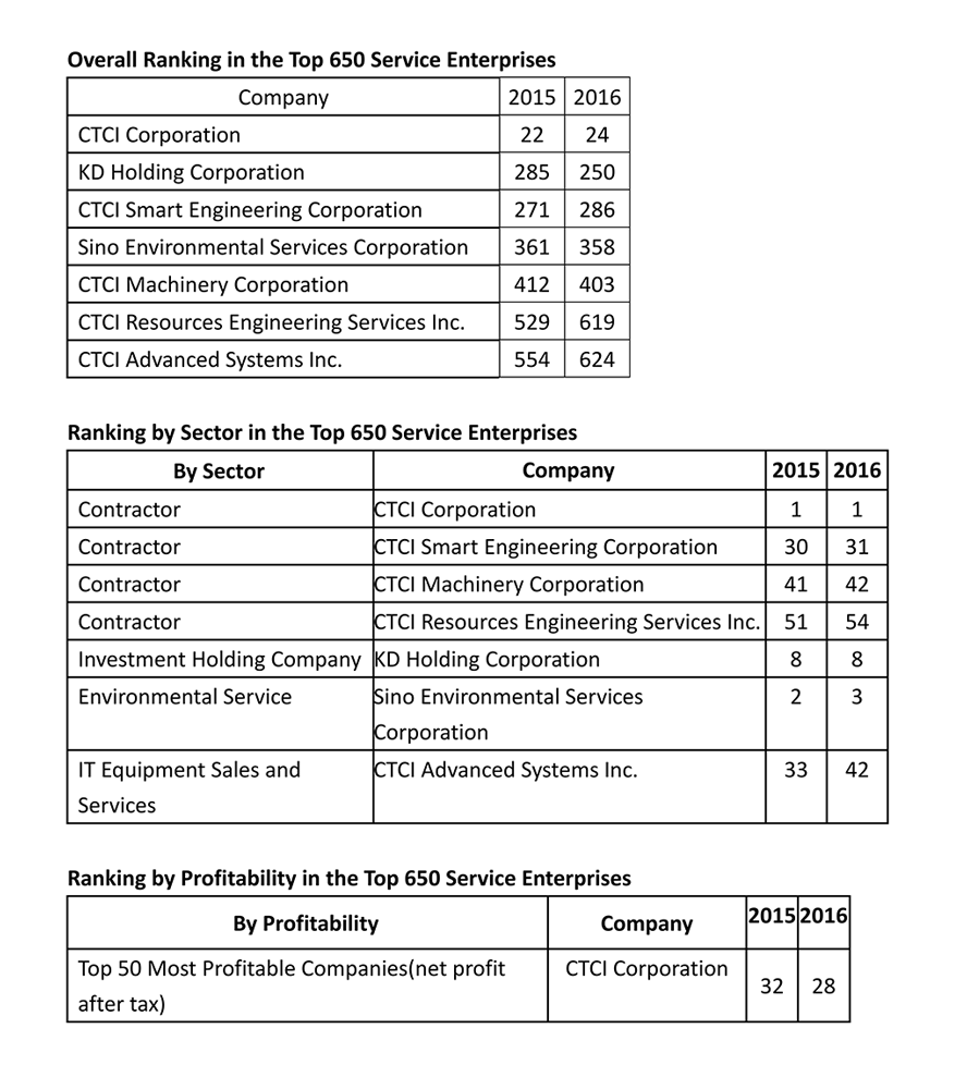 Tables below reveal all the rankings garnered by companies of CTCI group in various sectors of the 2017 Top 650 Service Enterprises. CTCI Corporation retained the top 3% in terms of the overall ranking in the 650 service sector and sustained the leader in the contractor sector. Moreover, its rank for profitability in the Top 650 Service Enterprises improved to the 28nd this year. KD Holding Corporation ranked the 250th in the 650 service sector and retained the 8th in the investment holding company sector this year. The other companies of CTCI group were also listed and awarded good ranks this year.