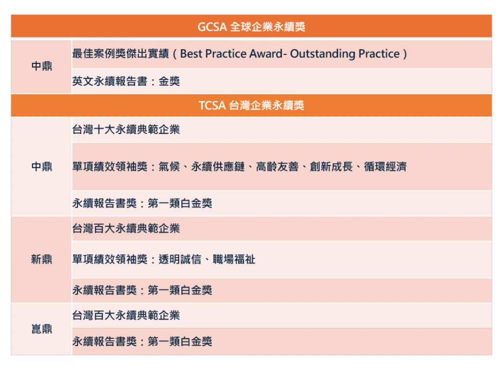 中鼎集團長期投入永續發展的優異成果,多年來屢獲國內外永續評比機構肯定,持續榮獲包括:國際道瓊領先指數(DJBICI)新興市場成分股;標普全球永續年鑑Top 1%最高榮譽,近三年蟬聯全球營建工程業第一;《遠見》ESG企業永續獎年度榮譽榜;《天下》永續公民獎等殊榮。