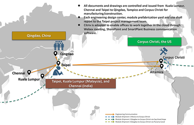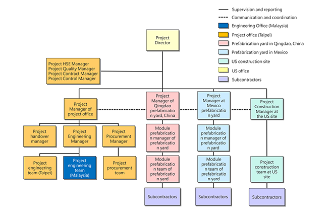 Unlike traditional engineering projects, which only have a single job site, this project adopts modular application. According to the capacity characteristics of the module prefabrication yard, the main process modules are moved out from the United States to the two module fabrication yards in Qingdao, China and Tampico, Mexico for prefabrication. Only the foundation piles, foundations and underground pipes that cannot be modularized are carried out at the US site. In addition, considering that the engineering design and procurement operations are majorly in Asia, Taipei had been established as a horizontal coordination hub to provide engineering drawings and facilitates materials expediting according to the project needs and progress. Under the supervision of project director, project managers of each region have their independent project teams responsible for module prefabrication and onsite construction. Apart from mutual coordination and communication , there are teams responsible for the HSE, quality, contract and project control functions that directly report to the project director and provide strategies and assistance when necessary. Specifically, the Taipei project team needs to overcome a time difference of 14 hours and act as a bridge for horizontal communication among the project teams in six different regions (Taiwan, the United States, China, Malaysia, India and Mexico) to coordinate drawings availability and material delivery.